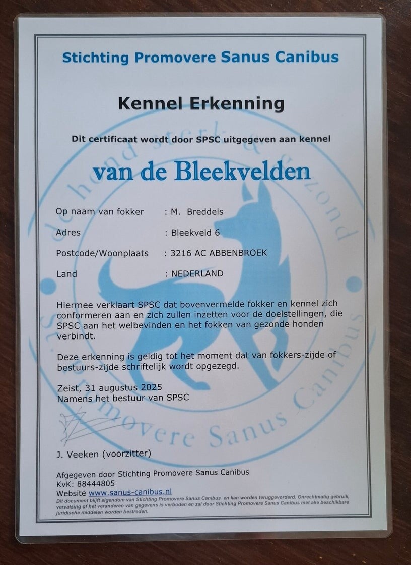 Welkom bij herder kennel De Bleekvelden. Mijn naam is Marissa. Ik ben een 23 jarige hobbyfokker bij Stichting Promovere Sanus Canibus(SPSC). Ik woon in het dorpje abbenbroek samen met mijn twee honden Nox en Enola. Mijn droom is om kynologisch instructeur en gedragstherapeut te worden. Hiervoor ben ik de komende jaren opleidingen aan het volgen. Ook wil ik doorgaan in het fokken van gezondere herders. Op 25 juli 2024 is mijn eerste nestje geboren. Dit nestje is van Nox van de Bleekvelden. Uit dit nest heb ik een pup aangehouden. Dit is Onyx van de Bleekvelden(Enola). Ik wil mijn honden graag inzetten als outcross voor bepaalde rassen. Zo hoop ik het inteelt bij deze rassen te verlagen en de gezondheid te verbeteren.